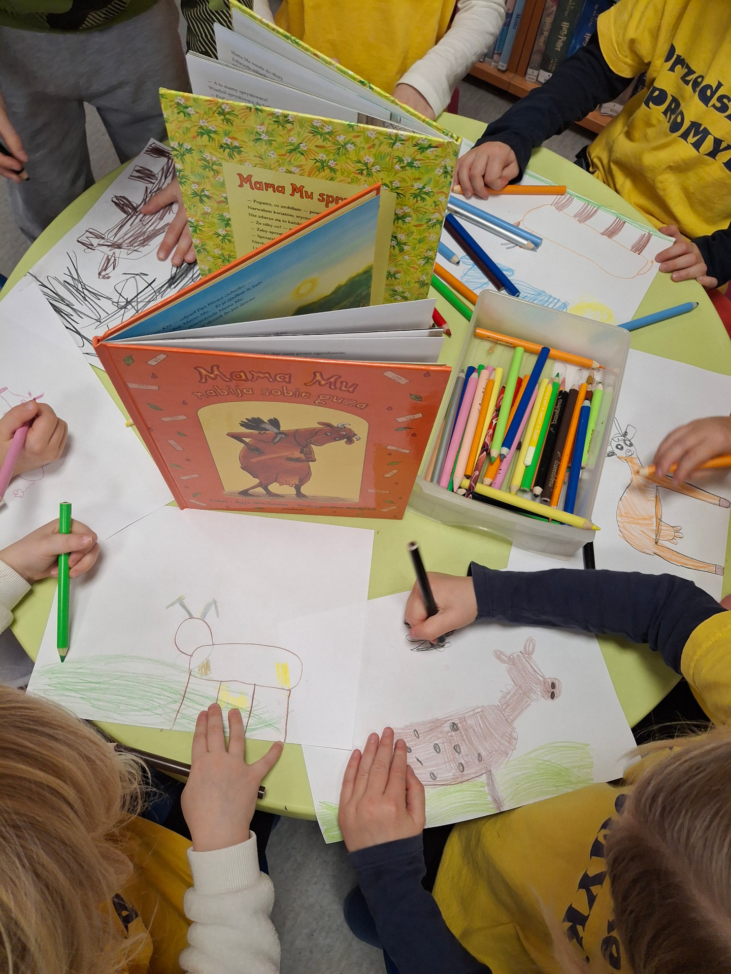 Przedstawiliśmy uczestnikom wszystkie książki z tej serii, aby uatrakcyjnić zajęcia oraz zaktywizować dzieci, postanowiliśmy wspiąć się „na drzewo jak krowa” oraz „polatać jak Pan Wrona”. Gdy emocje nieco opadły, wspólnie wymyślaliśmy nowe przygody tytułowych bohaterów, które dzieci następnie przenosiły na papier.