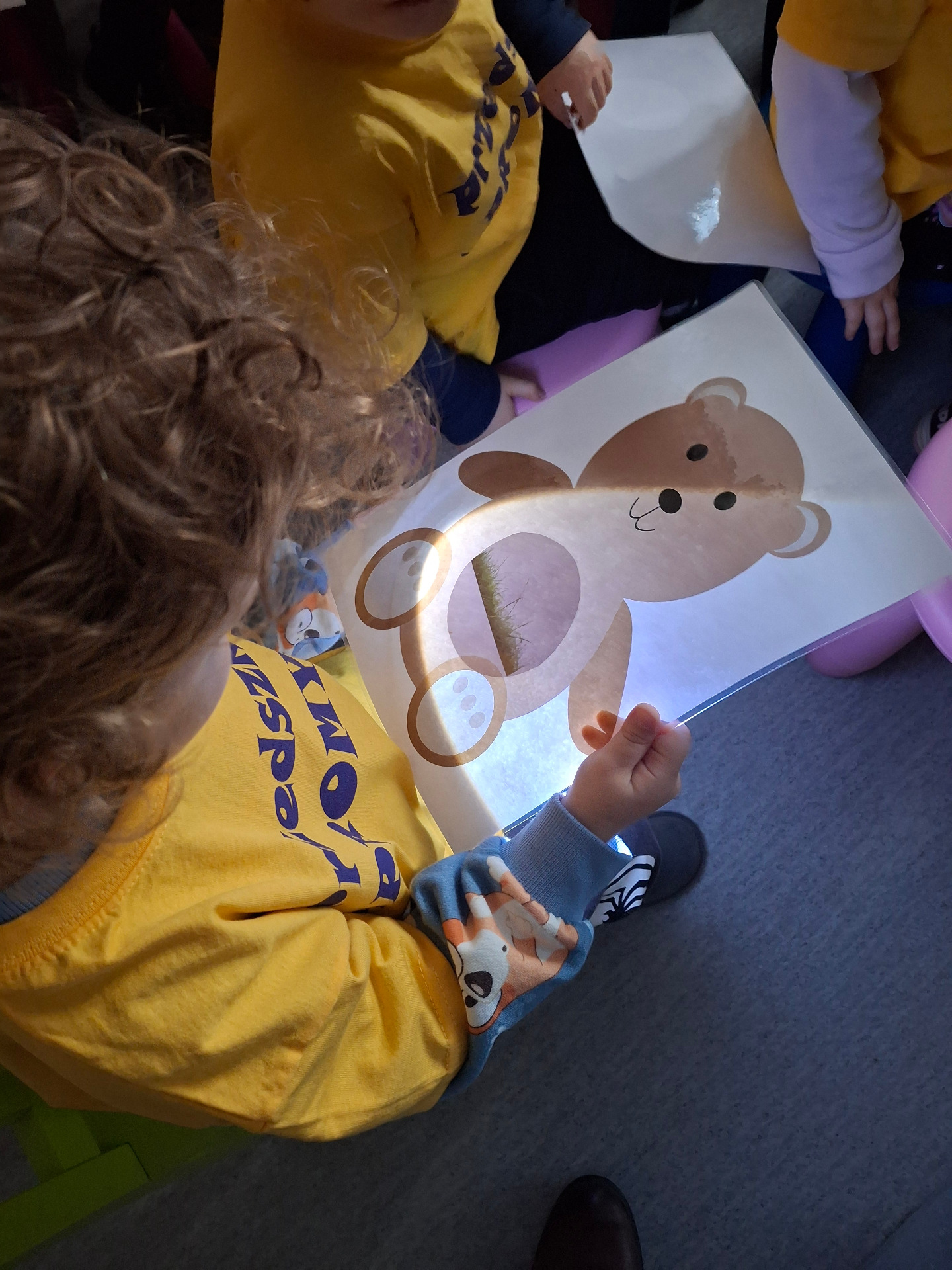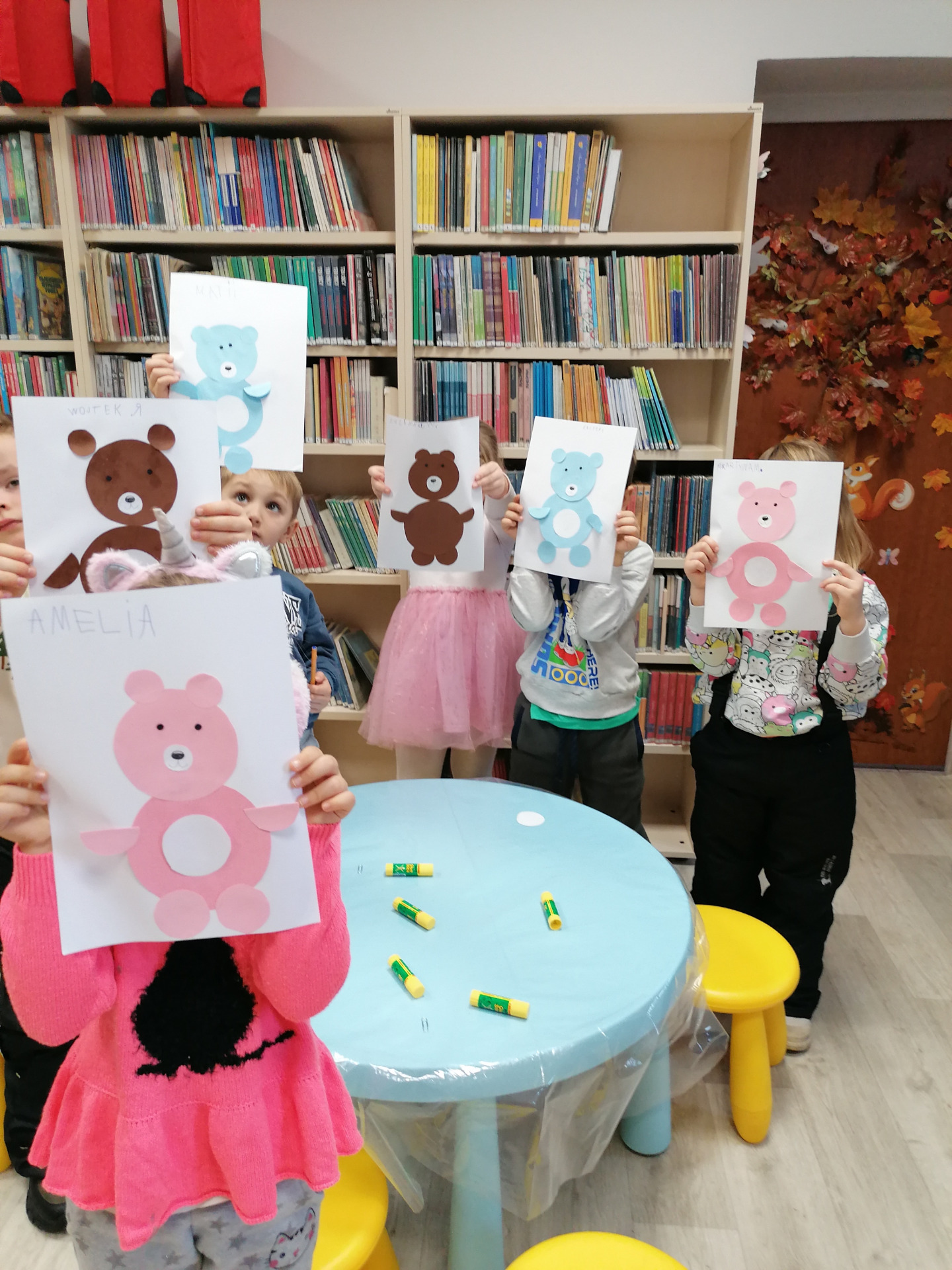 W siedzibie głównej czytaliśmy książkę „Niedźwiadek szuka przyjaciół”, układaliśmy puzzle i odkrywaliśmy, co właściwie jedzą niedźwiedzie. Rozmawialiśmy również o misiach – zarówno bajkowych, jak i tych żyjących naprawdę. Niektóre dzieci zaskoczyły nas swoją imponującą wiedzą, a inne z wielkim przekonaniem twierdziły, że w naszej puszczy można spotkać prawdziwego niedźwiedzia