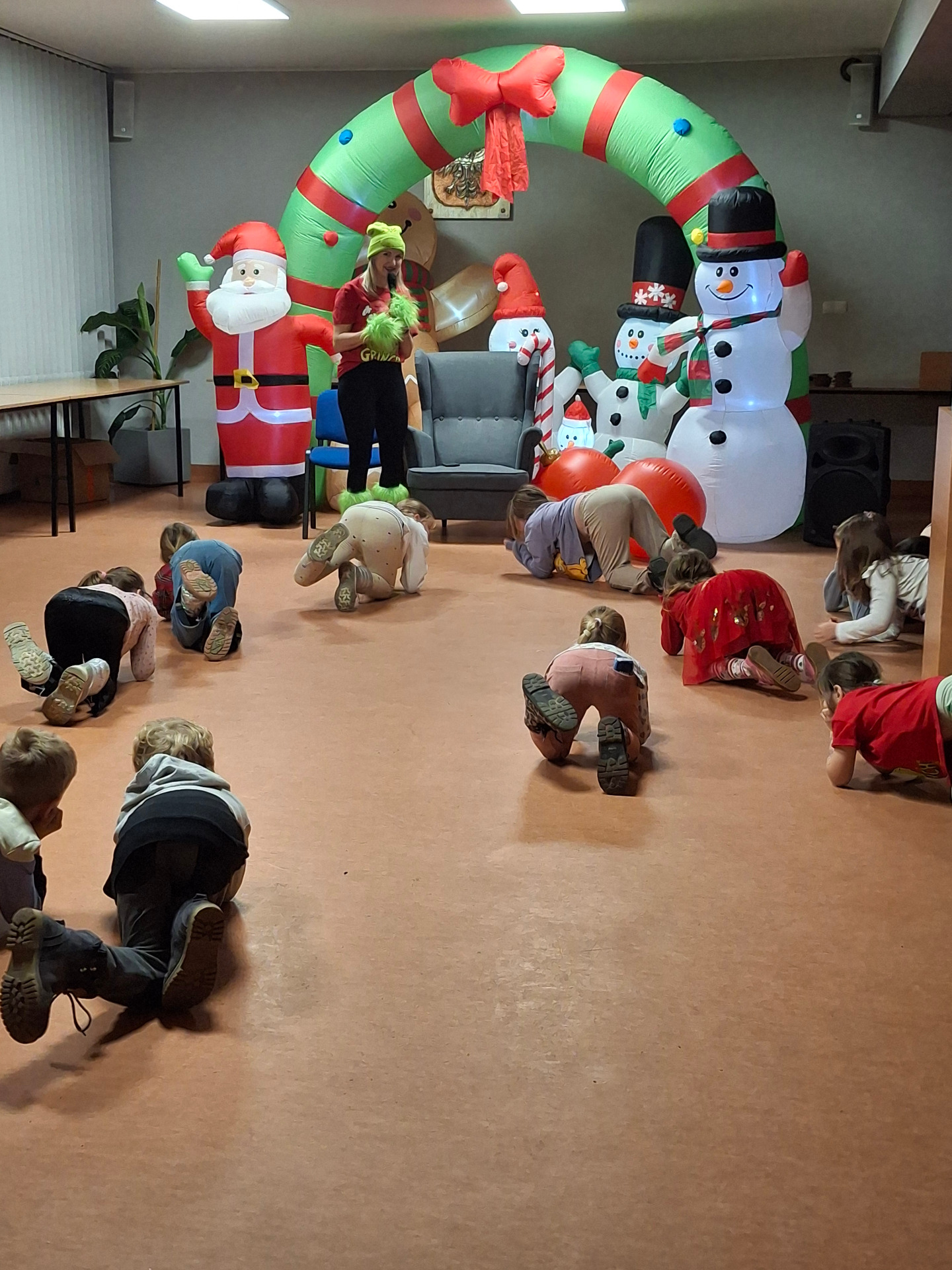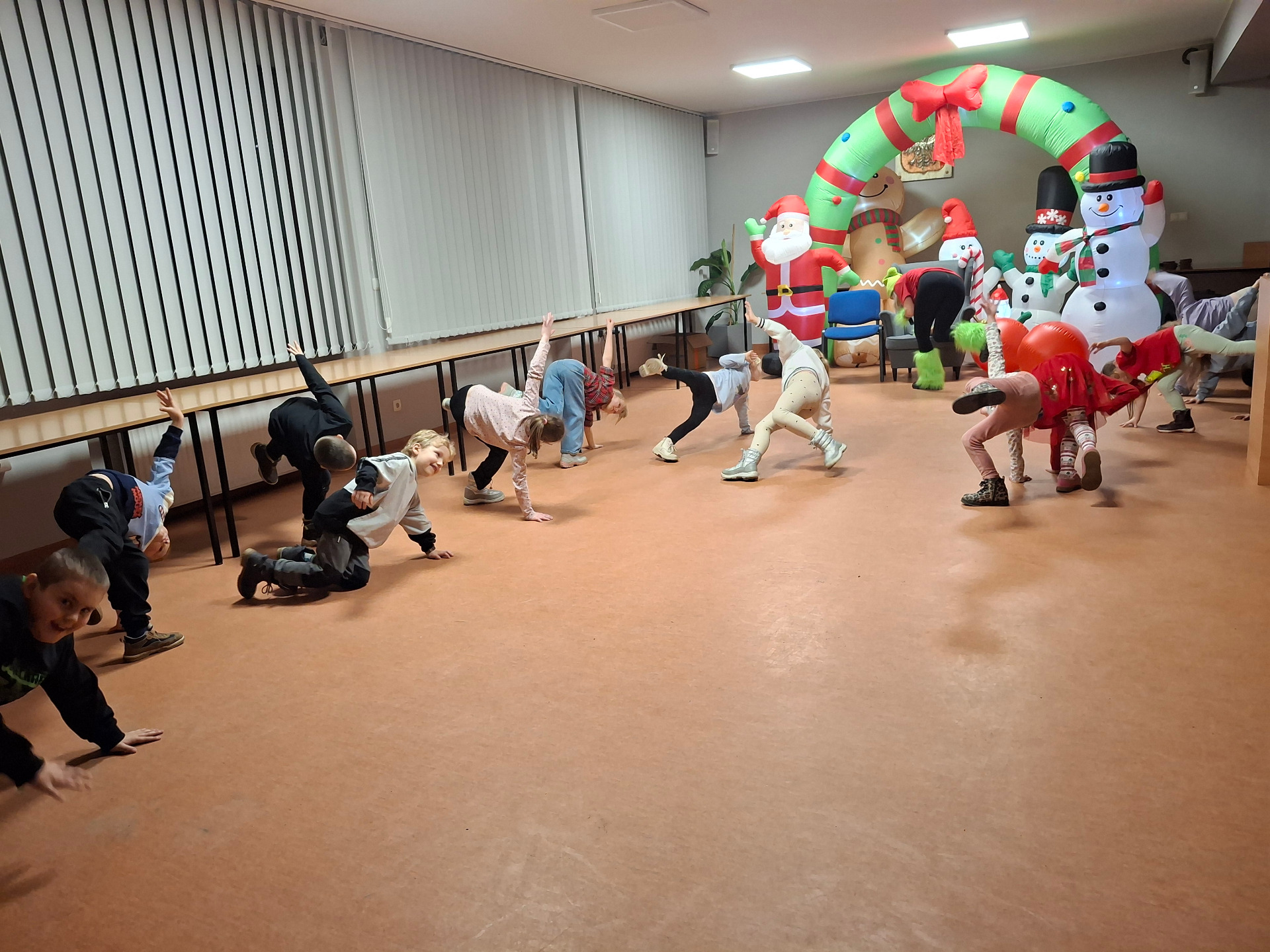 We wtorek, 16 grudnia, odbyły się świąteczne animacje, które poprowadziła animatorka Ania Wieczorek. Było to pełne radości i energii spotkanie, podczas którego dzieci brały udział w różnorodnych zabawach ruchowych. Biegały, ćwiczyły podczas krótkiej gimnastyki, uczyły się koncentracji oraz musiały wykazać się czujnością, ponieważ po sali krążył psotnik, który co chwilę próbował wszystko popsuć.